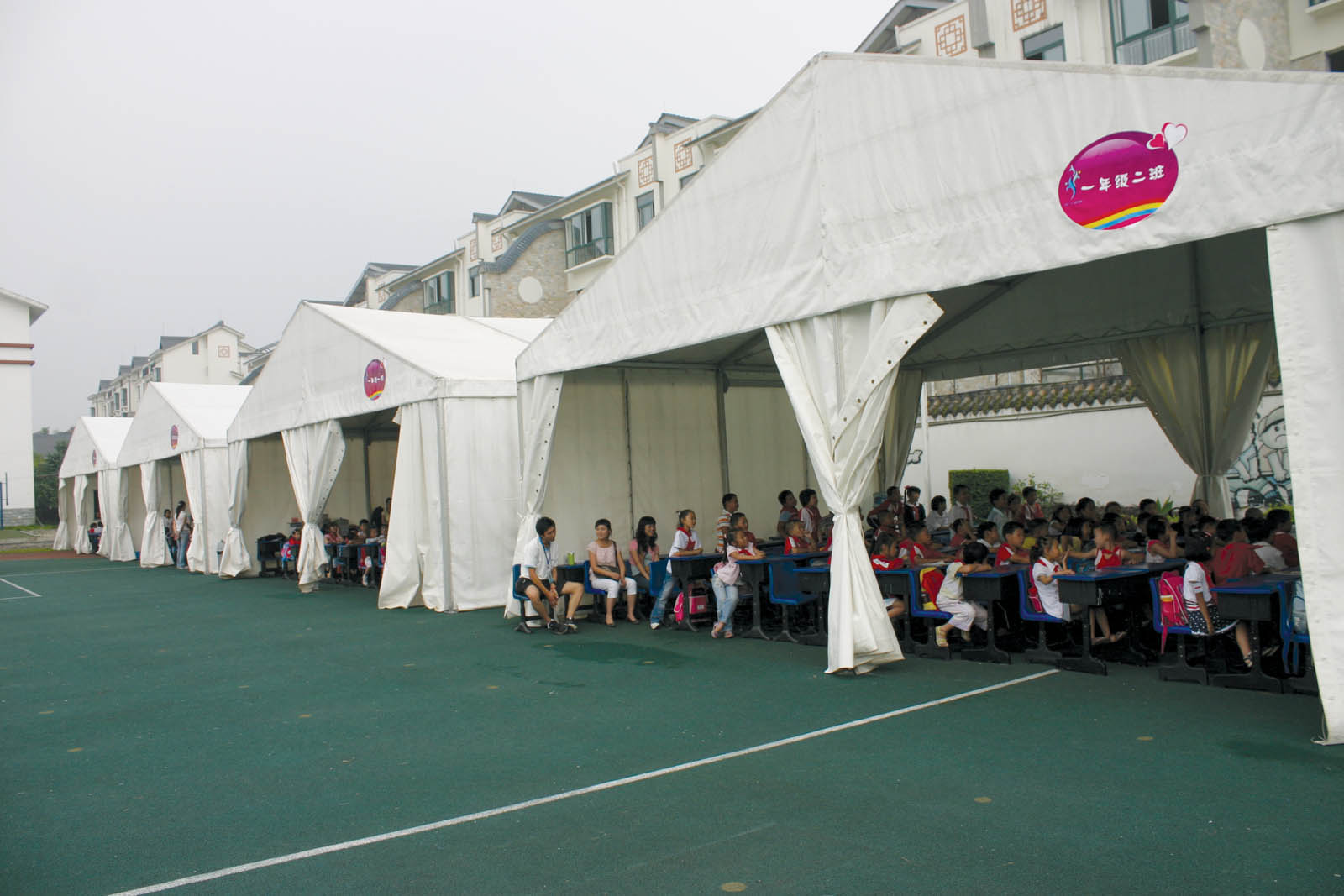 Two additional Losberger tents have now been nicely painted by students of the German School and Jinan District Middle School in Shanghai; the students wanted to express their sympathy and support for their contemporaries in the disaster area. The tents arrived in Sichuan on June 1, the official “Children’s Day” in China. They’re being used as temporary classrooms and accommodations for students.